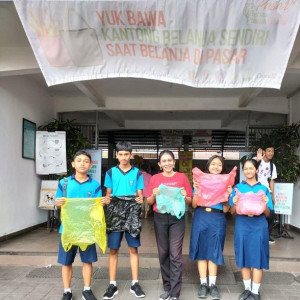 Ibu Kepala Sekolah dengan perwakilan Siswa dari OSIS ikut dalam Pembuatan film tentang pasar bebas plastik sekali pakai dengan menggantikan plastik pengunjung